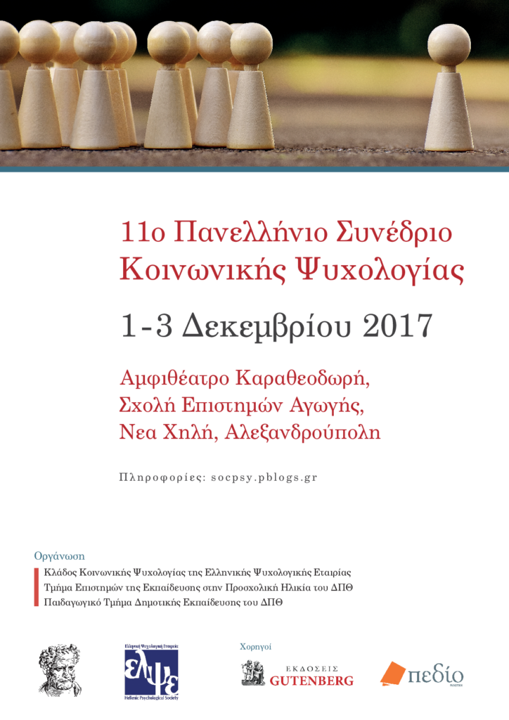 Ο κλάδος Κοινωνικής Ψυχολογίας της Ελληνικής Ψυχολογικής Εταιρείας, το Τμήμα Επιστημών της Εκπαίδευσης στην Προσχολική Ηλικία και το Παιδαγωγικό Τμήμα Δημοτικής Εκπαίδευσης του Δημοκρίτειου Πανεπιστημίου Θράκης έχουν τη χαρά να αναγγείλουν την οργάνωση του 11ου Πανελλήνιου Συνεδρίου Κοινωνικής Ψυχολογίας στη Σχολή Επιστημών Αγωγής του Δημοκρίτειου Πανεπιστημίου Θράκης (αμφιθέατρο Καραθεοδωρή) στην Αλεξανδρούπολη, από την Παρασκευή 1 Δεκεμβρίου μέχρι την Κυριακή 3 Δεκεμβρίου 2017.