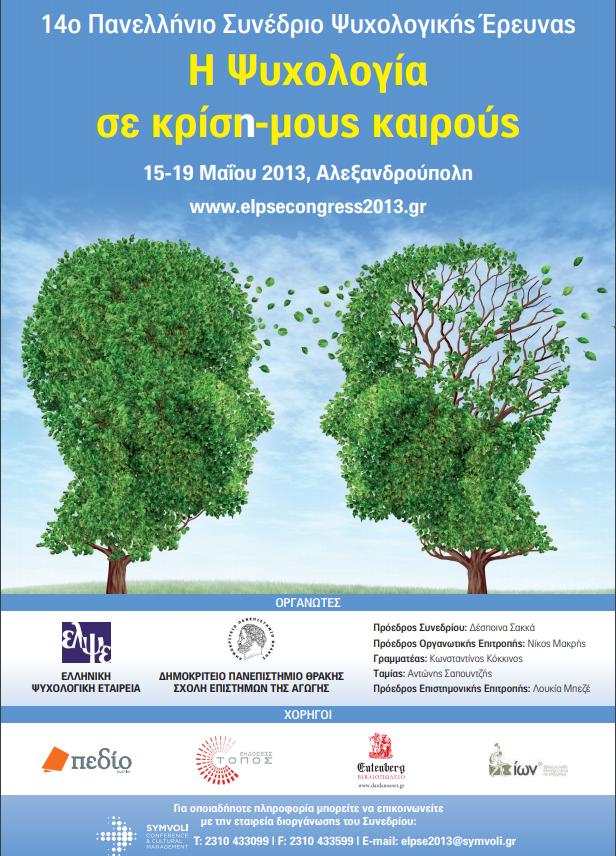 Με ιδιαίτερη χαρά σας προσκαλούμε στο 14ο Πανελλήνιο Συνέδριο Ψυχολογικής Έρευνας το οποίο θα πραγματοποιηθεί στην Αλεξανδρούπολη στις 15-19 Μαΐου 2013, με κεντρικό θέμα «Η Ψυχολογία σε κρίση-μους καιρούς», μια ιδιαίτερα επίκαιρη θεματολογία που κινείται γύρω από τους άξονες Κρίσιμοι καιροί / Η Ψυχολογία στην κρίση / Η Ψυχολογία υπό κρίση.