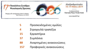 17ο Πανελλήνιο Συνέδριο Ψυχολογικής Έρευνας – 15 έως 19 Μαΐου Ανακοινώσεις για επιστημονικές και εκπαιδευτικές δράσεις 17ο Πανελλήνιο συνέδριο ψυχολογικής έρευνας http://www. elpse2019.gr/ ΔΕΙΤΕ ΑΝΑΛΥΤΙΚΑ ΤΟ ΠΡΟΓΡΑΜΜΑ ΤΟΥ ΣΥΝΕΔΡΙΟΥ ΕΔΩ
