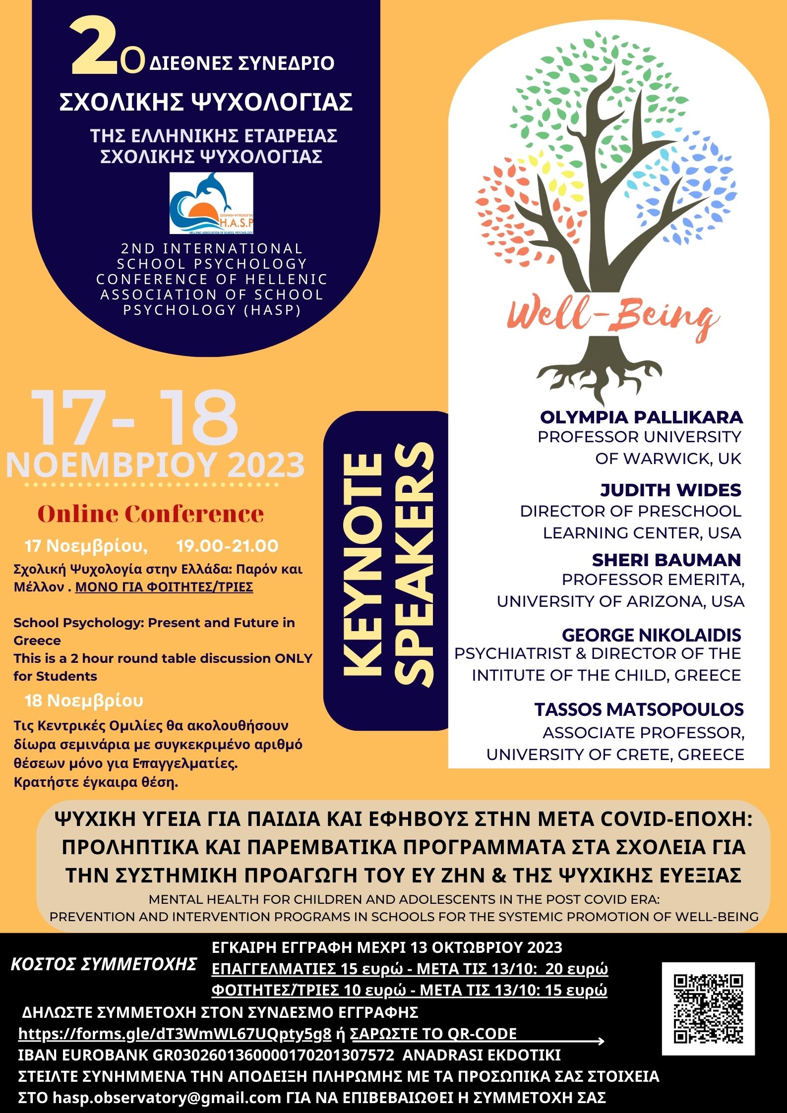 Με μεγάλη μας χαρά σας ενημερώνουμε ότι την Παρασκευή και το Σάββατο 17 & 18 Νοεμβρίου θα πραγματοποιηθεί το 2ο διαδικτυακό διεθνές συνέδριο με τίτλο: «ΨΥΧΙΚΗ ΥΓΕΙΑ ΓΙΑ ΠΑΙΔΙΑ ΚΑΙ ΕΦΗΒΟΥΣ ΣΤΗΝ ΜΕΤΑ COVID- ΕΠΟΧΗ: ΠΡΟΛΗΠΤΙΚΑ ΚΑΙ ΠΑΡΕΜΒΑΤΙΚΑ ΠΡΟΓΡΑΜΜΑΤΑ ΣΤΑ ΣΧΟΛΕΙΑ ΓΙΑ ΤΗ ΣΥΣΤΗΜΙΚΗ ΠΡΟΑΓΩΓΗ ΤΟΥ ΕΥ ΖΗΝ & ΤΗΣ ΨΥΧΙΚΗΣ ΕΥΕΞΙΑΣ” από την Ελληνική Εταιρεία Σχολικής Ψυχολογίας HASP.