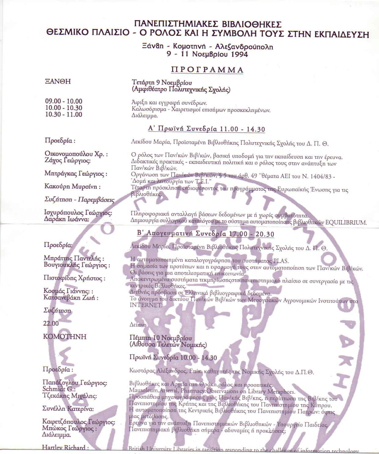 Δημοκρίτειο Πανεπιστήμιο Θράκης, 9-11 Νοεμβρίου 1994