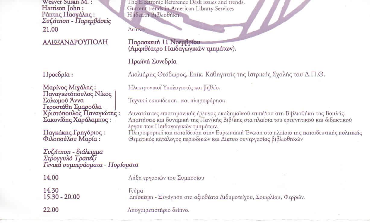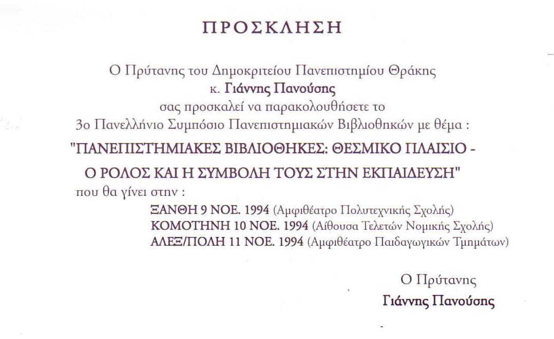 Οι εργασίες του 3ου Πανελληνίου Συμποσίου για τις Ακαδημαϊκές Βιβλιοθήκες διεξήχθησαν στις τρεις πόλεις της Θράκης: Ξάνθη (9/11/94), Κομοτηνή (10/11/94) και Αλεξανδρούπολη (11/11/94). Στην Αλεξανδρούπολη οι εργασίες του συμποσίου διεξήχθησαν στο Αμφιθέατρο των Παιδαγωγικών Τμημάτων.
