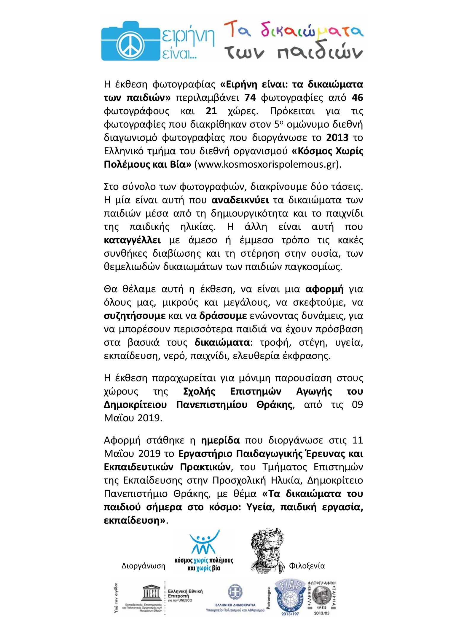 - 2017 – Ημερίδα “Τα δικαιώματα του παιδιού σήμερα στον κόσμο. Υγεία, παιδική εργασία, εκπαίδευση“, 11 Μαΐου 2017”.